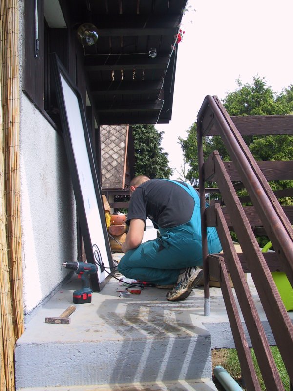 První test, první pokusy se střídačem. Tehdejší baterie 400Ah + 600W střídač s čistým sinusem.
