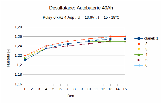 Jak je vidět z grafu, hustoty všech článků se zvedaly přibližně stejně. Po 13 dnech již byla v jednotlivých článcích hustota v rozmezí 1,25 až 1,26. Pak už se dále nezvyšovala. Baterie byla odzkoušena v autě a i po několika dnech stání venku na mrazu byla provozuschopná.