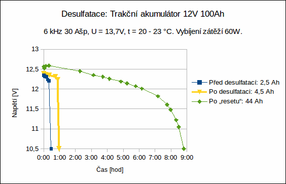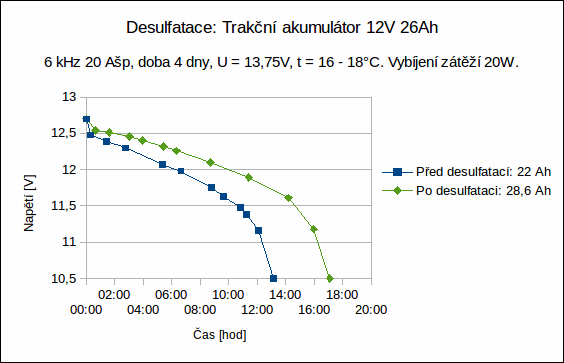 Doba od připojení zátěže 20 W po pokles napětí na úroveň 10,5 V byla před desulfatací 13 hodin a 10 minut, což odpovídá 85% jmenovité kapacity. Baterie byla ihned po skončení měření nabita proudem C/10 do napětí 13,75V, nechána na tomto napětí po dobu 24 hodin a celé měření se opakovalo pro lepší věrohodnost. Rozdíl obou měření byl zanedbatelný.