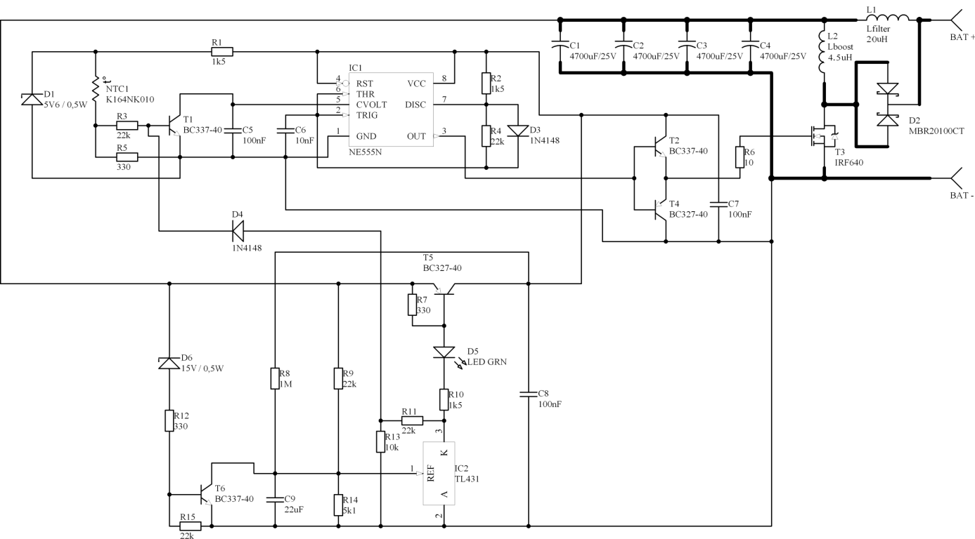 Princip zařízení je inspirován zapojením publikovaným Alastairem Couperem. V podstatě pracuje jako zvyšující měnič („boost“), složen z prvků L2, T3, D2. Protože chceme do akumulátoru posílat pulsy, není na výstupu zvyšujícího měniče zařazen filtr. Protože chceme zařízení napájet z toho samého zdroje – baterie, která pracuje v ostrovním energetickém (nebo jiném) systému a kterou chceme desulfátovat, je potřeba vytvořit pevný potenciál, ze kterého bude zvyšující měnič napájen. To zajišťuje dolní propust tvořena LC filtrem složeným z cívky L1 a kondenzátorů C1 až C4.